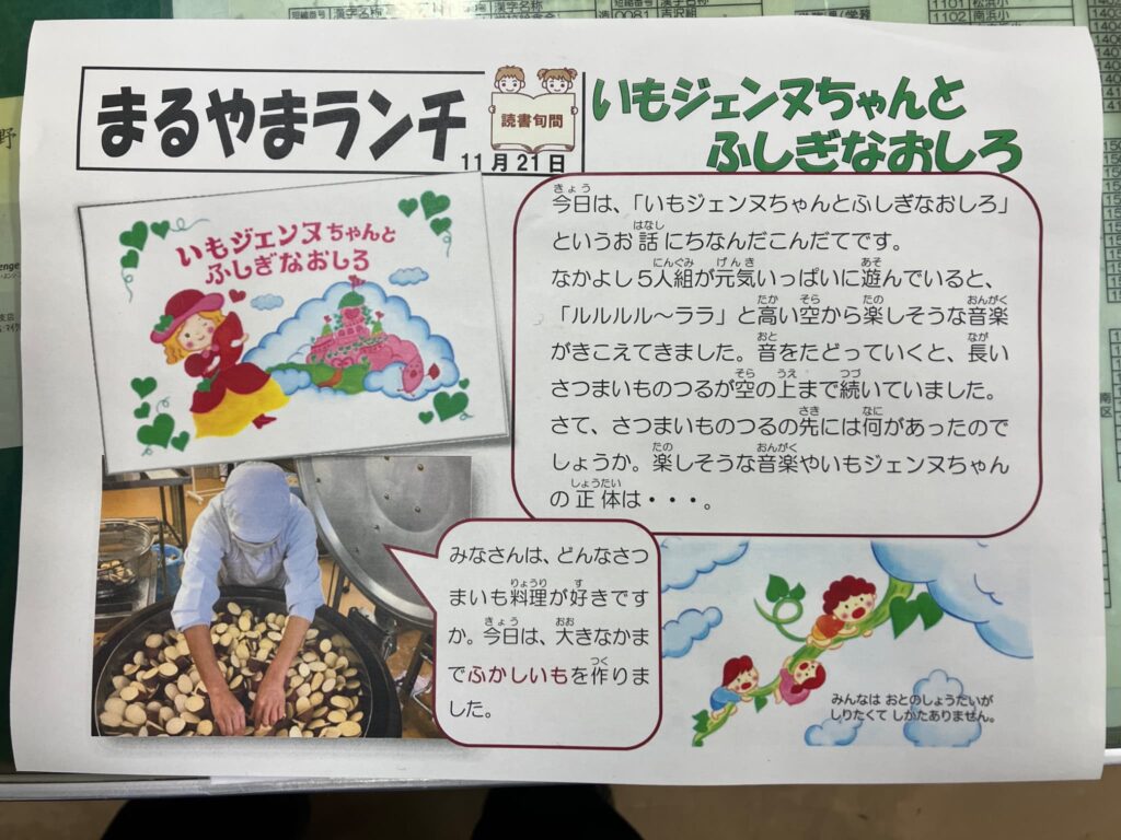 そして、今日は読書旬間の4日目です。今日の給食は「いもジェンヌちゃんとふしぎなおしろ」の本にちなんだメニューです。