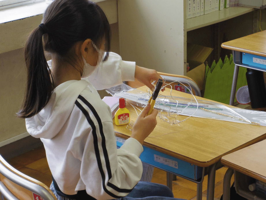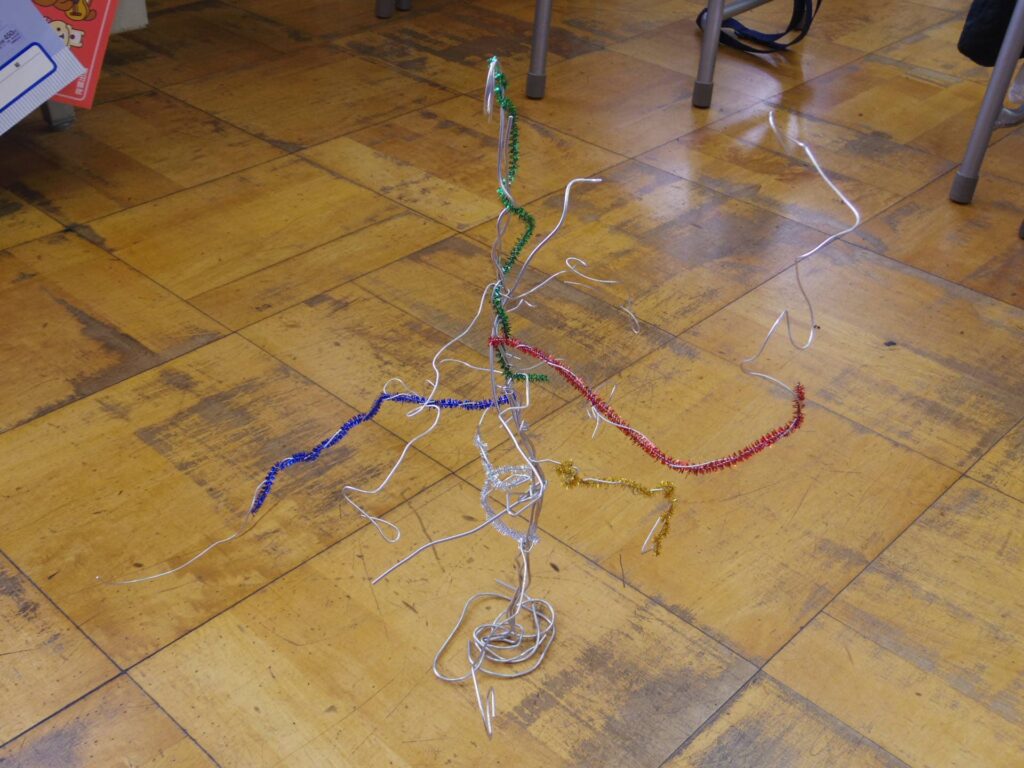5年生では図工で針金アートを製作中でした。自在に曲げたり切ったりできるという針金の特性を生かしながら作ると、こんなにも抽象的な芸術作品が生まれるのですね。