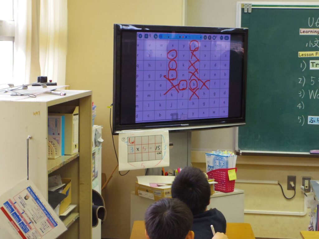 アルファベットをただ書いたり読んだりするのでは楽しくありません。ペアで交互に発音をしながら5マス並んだら勝ちというオセロ風のゲームでアルファベットの定着を図ります。