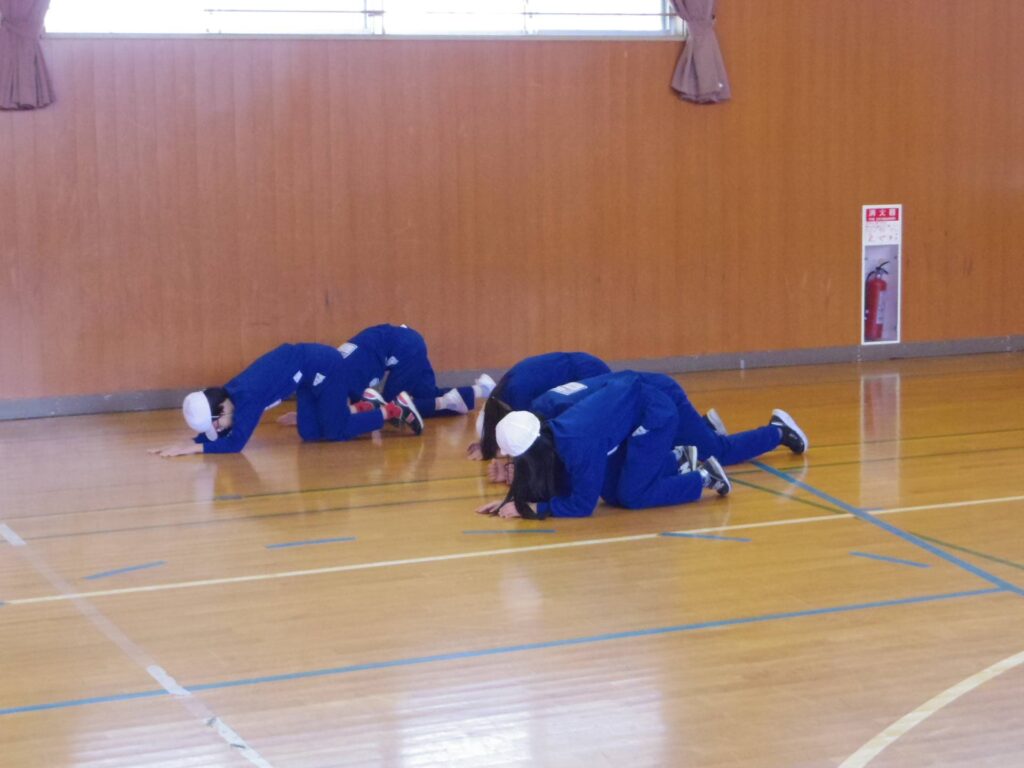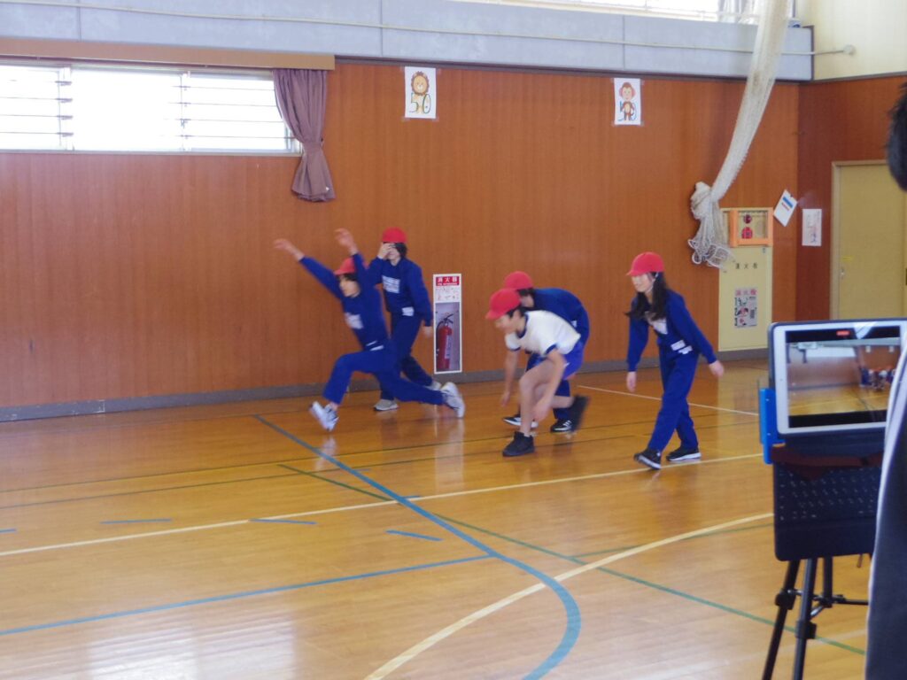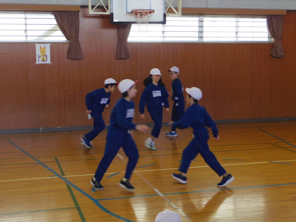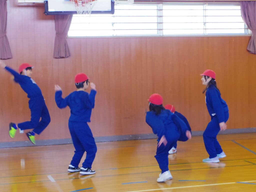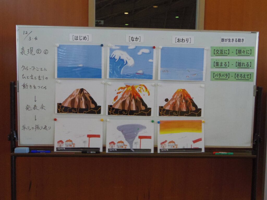 今日は冷えましたね。朝、チラチラ雪も降りました。冷蔵庫のように冷えた体育館では、5年生が元気に体育をしていました。「台風」「火山」「津波」などの自然災害について、動きや特徴を体で表現する発表会の場面でした。ルーレットで決めた順番でグループごとに発表します。