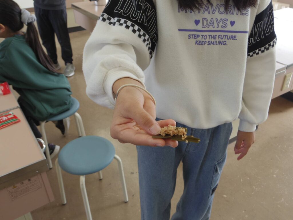 全く別の話に変わりますが、家庭科室で味噌汁づくりの調理実習をしていたクラスの様子を見に行ったら、もう会食後で「残念」と思っていたら、子どもたちはダシ取り後のコンブやカツオぶしをパクパク食べながら、「おいしい」「おいしい」と喜んでいました。フードロスへの意識があるかどうかは別として、私も子どもの頃、味噌汁のダシ用のニボシを楽しみに食べていた記憶がよみがえりました。(こちらもヘンテコな余談ですみません。)
