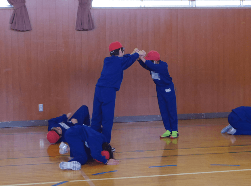 最後に、台風を表現したグループの様子です。台風の目を中心にして少しずつ回転を速くしたり、上下運動で螺旋感を出したり…