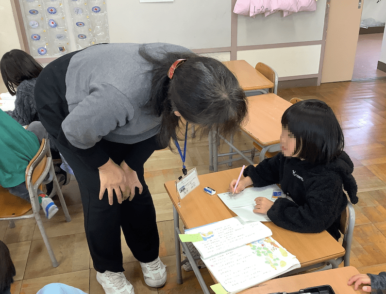 先生は教室を回りながら賞賛やアドバイスの声かけをして、子どもたちをもっとやる気にさせます。