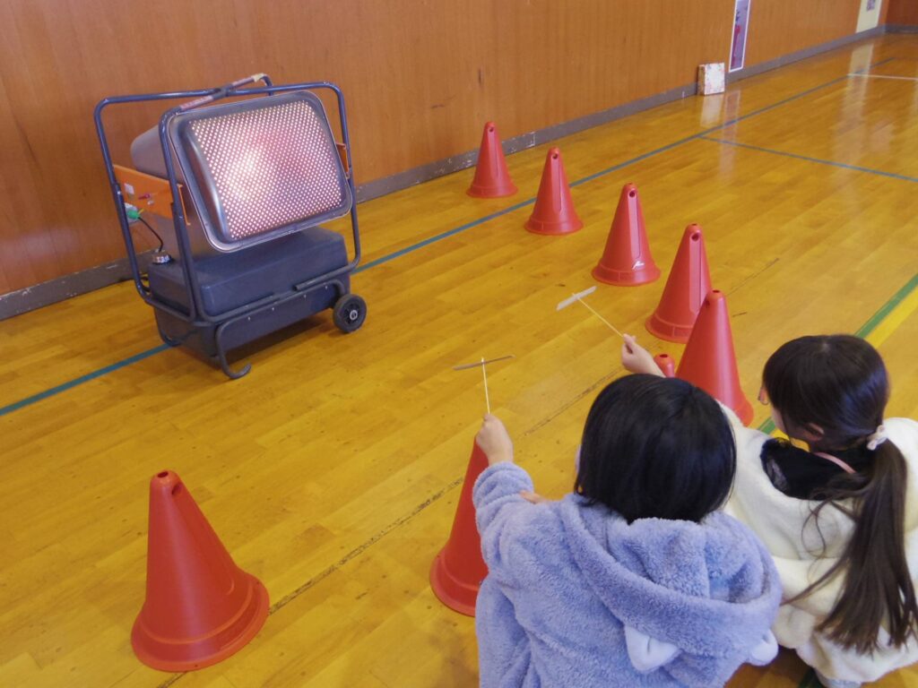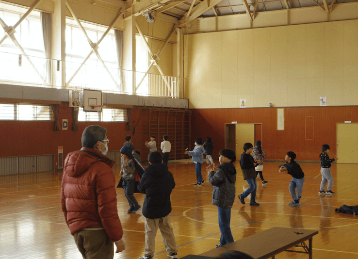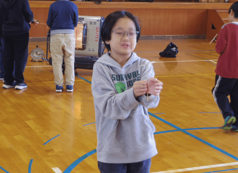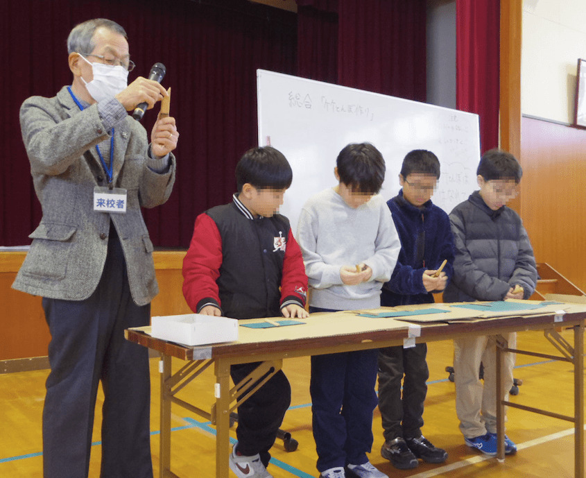 今日は講師の先生をお呼びして、3年生が竹とんぼづくりをしました。総合学習で地域のお宝探しをする過程で、丸山地区には竹が多いことを知り、竹を使った遊びをしたいという子どもたちの思いからこの授業を企画しました。