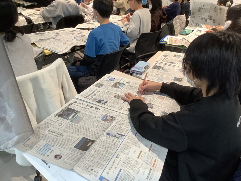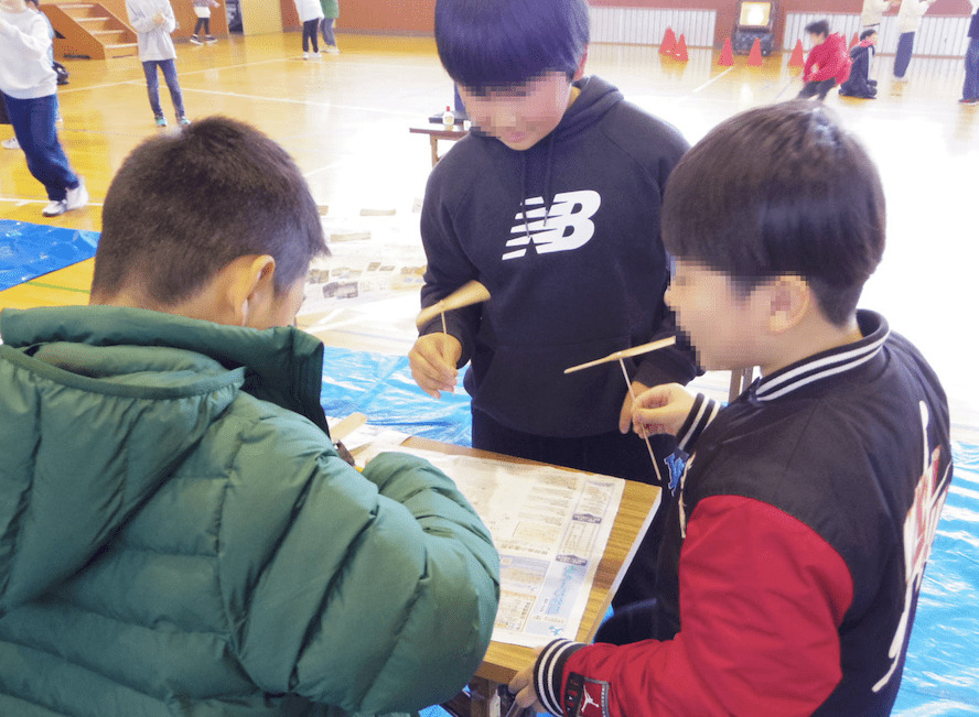 竹とんぼづくりにみんな夢中になり、時間があっという間に過ぎてしまいました。中には冬休みの自由工作でもっと高く飛ぶのを作りたいと思った子もいたのではないでしょうか。一方、5年生は社会科の校外学習で新潟日報メディアシップと、新潟総合テレビNSTを訪れました。まずは新聞の勉強です。新潟日報の方から新聞の読み方や作り方を詳しく教えていただきました。