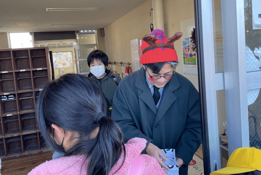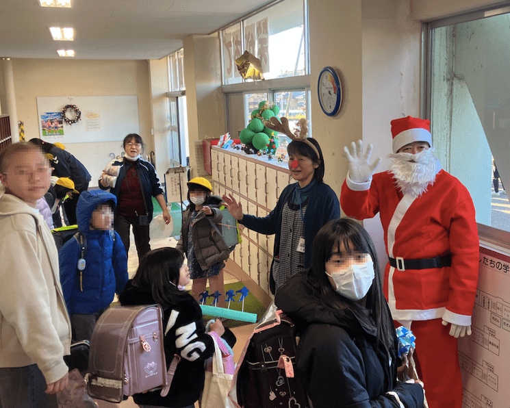 5時間目が終わって全校下校です。玄関前では「メリークリスマス!」「よいお年を〜!」と言って、サンタさんやトナカイさんが、子どもたちを見送ってくださいました。