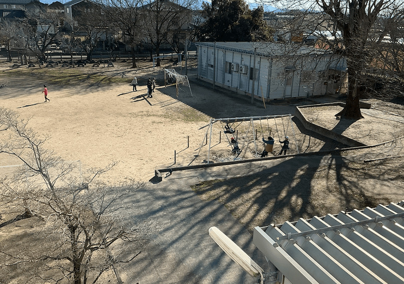 お昼休みもグラウンドでたくさんの人たちが遊んでいました。澄んだ空気の中、ブランコ遊び楽しい〜
