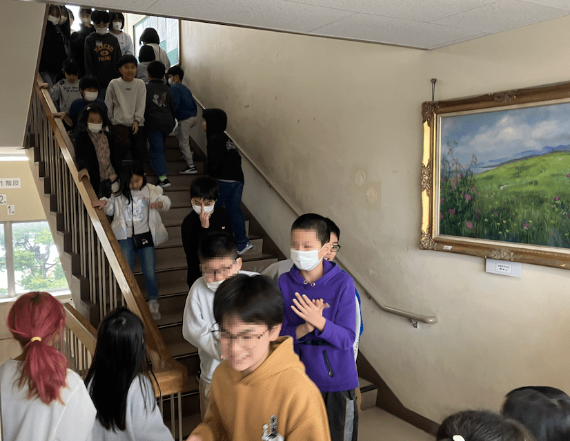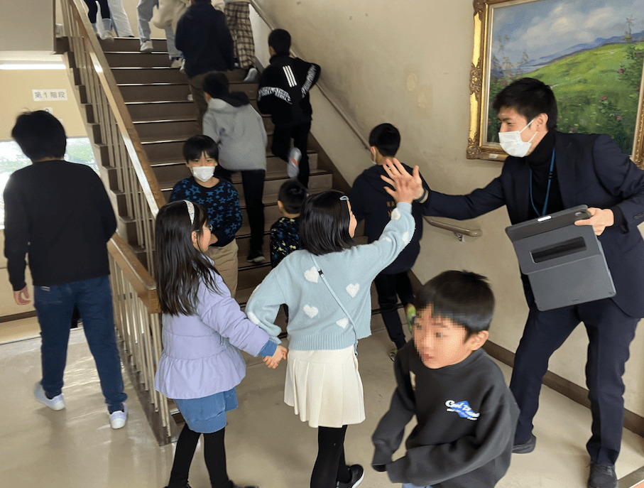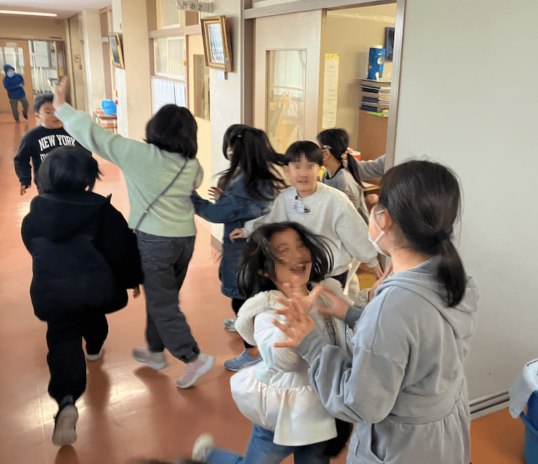 その後、校長からあいさつについて全校にメッセージを送りました。丸山小の6年生の人が考えたあいさつ標語の優秀作品「朝昼晩 あなたの一言 笑顔さく」を紹介しながら、あいさつは相手も自分も笑顔になるための魔法の言葉であることや、誰もが持っているその魔法の言葉をどんどん使って全校に笑顔の花を広げてほしいことなどをお話ししました。その一環として、今日は、自分の教室や全校を回りながら「あけましておめでとう」をつなげる「あいさつチャレンジ」作戦をすることにしました。5、4、3、2、1、スタート!音楽が流れている間、できるだけたくさんの人にあいさつをして回ります。