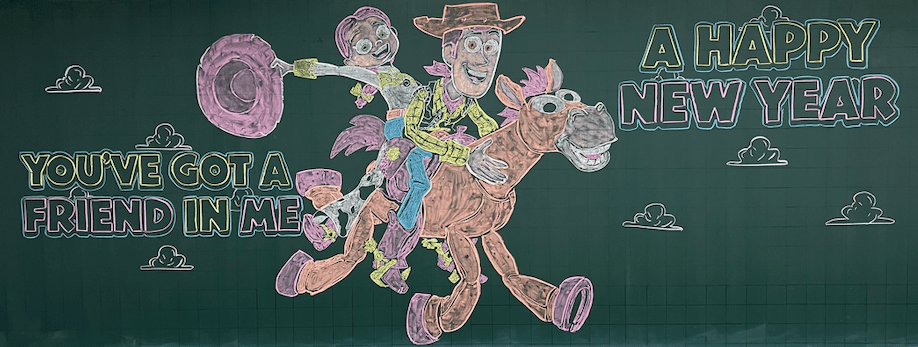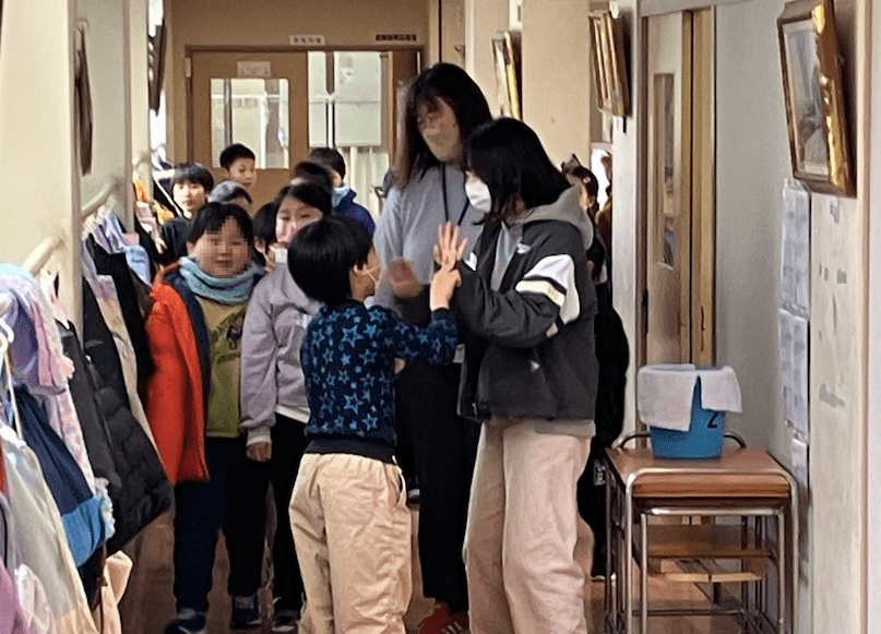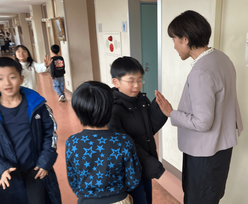 その後、校長からあいさつについて全校にメッセージを送りました。丸山小の6年生の人が考えたあいさつ標語の優秀作品「朝昼晩 あなたの一言 笑顔さく」を紹介しながら、あいさつは相手も自分も笑顔になるための魔法の言葉であることや、誰もが持っているその魔法の言葉をどんどん使って全校に笑顔の花を広げてほしいことなどをお話ししました。その一環として、今日は、自分の教室や全校を回りながら「あけましておめでとう」をつなげる「あいさつチャレンジ」作戦をすることにしました。5、4、3、2、1、スタート!音楽が流れている間、できるだけたくさんの人にあいさつをして回ります。