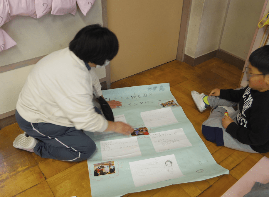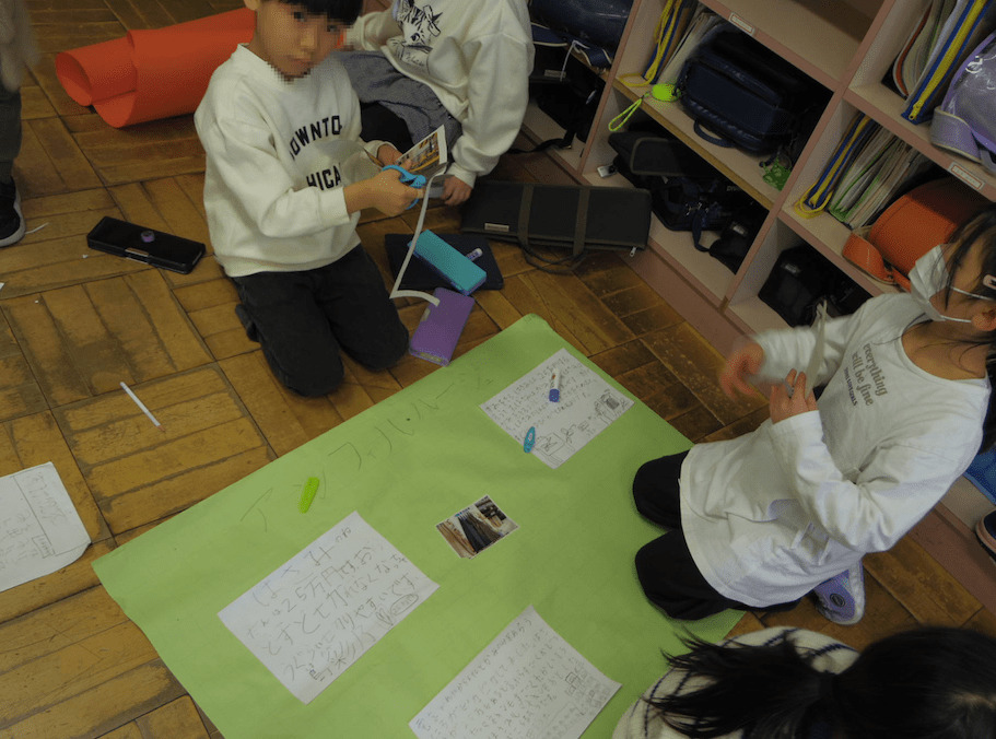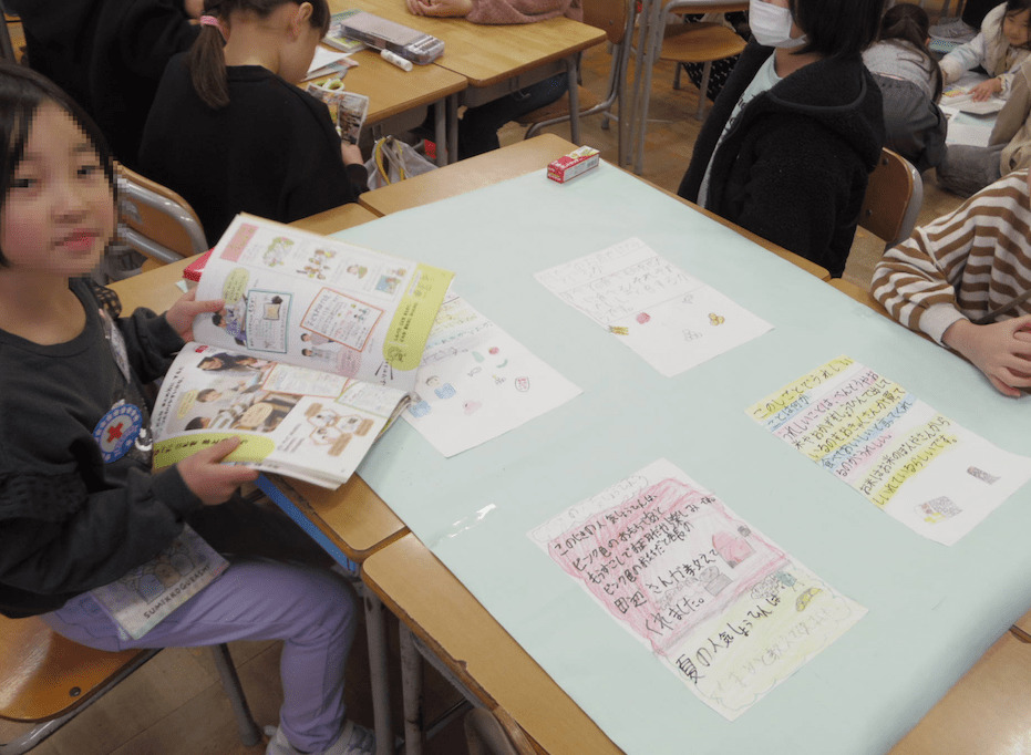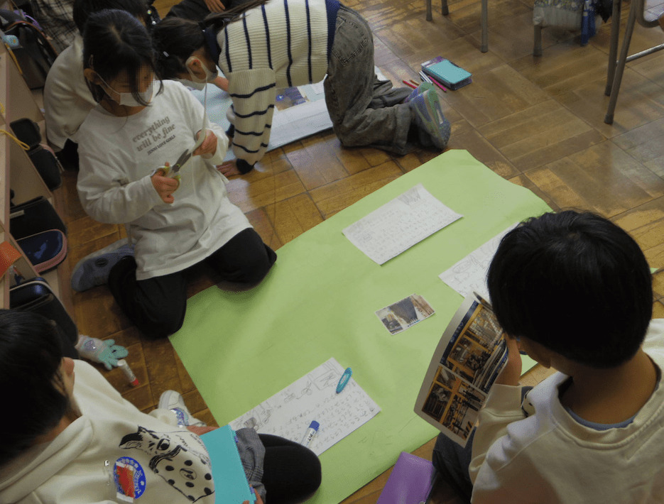 2年生では学年合同の生活科の時間でした。まち探検で学んだことをポスターにしたり、ガイドブックにしたりして、友だちと協力してまとめていました。先生の細かい指示や支援がなくても、子どもたちだけで主体的・協働的に活動ができるのは、教師が要所要所で子どもの目的意識と相手意識を引き出したり確認したりしているからなのです。