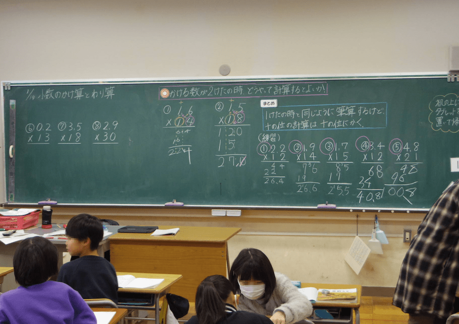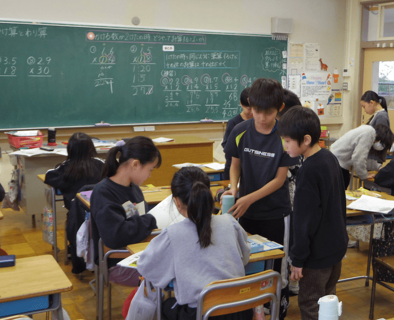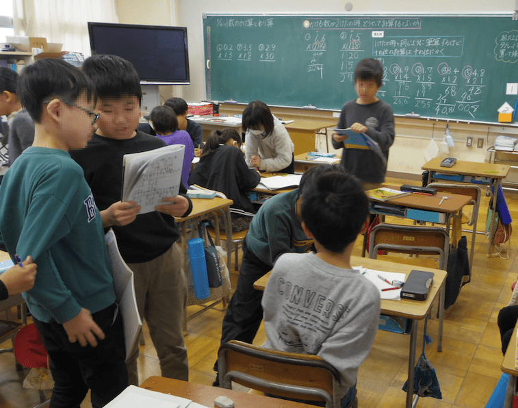 4年1組の先生は算数が専門です。学習のまとめをした後の練習問題をする場面でした。さすがだなと思ったのは、練習問題をさせっぱなしではなく、友だち同士で分からないところはないか立ち歩いて確かめ合う、いわゆる自由な「学び合い」の場面を取り入れていることです。