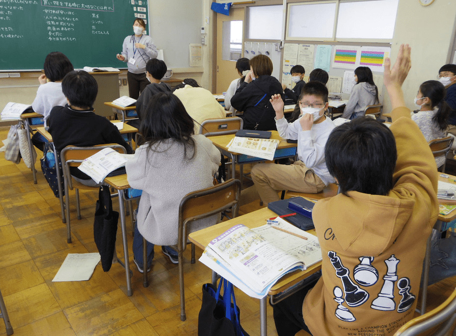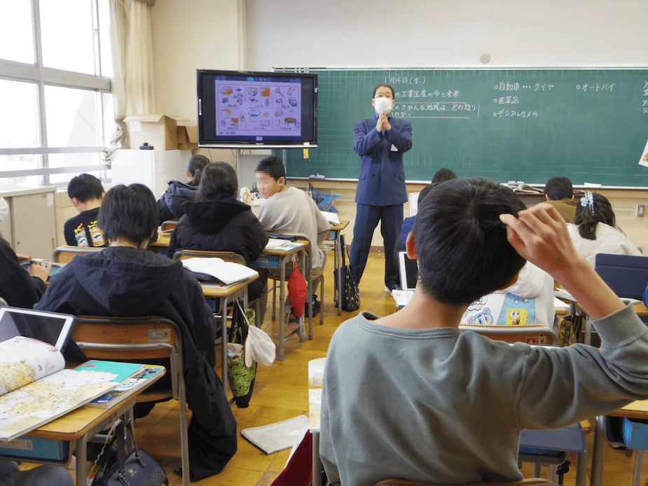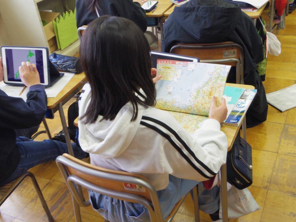 隣の5年2組では、社会科の授業をしていました。こちらも担任以外の先生が教えていました。日本のどの地域でどんな工業がさかんかを地図帳やタブレットで調べていました。