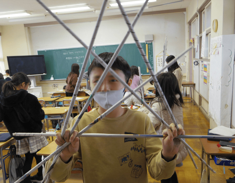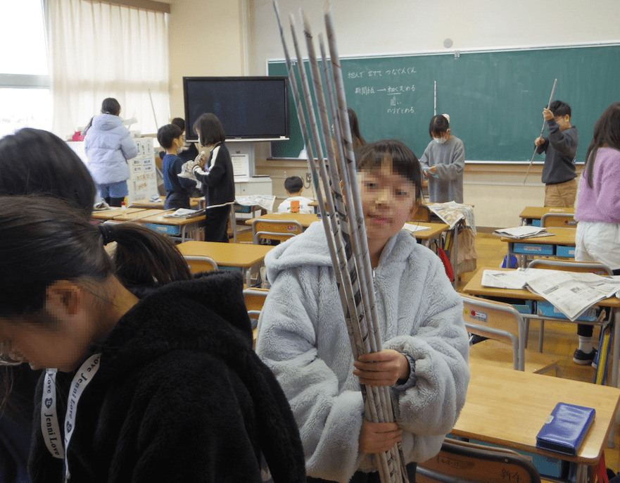 4年2組の先生は図工が専門です。今日も新聞紙を使った楽しい活動をしていました。子どもたちは造形遊びを楽しみながら、素材の特性に気付いたり、組み合わせて何かに見立てたりして、創造の幅を広げていくのです。