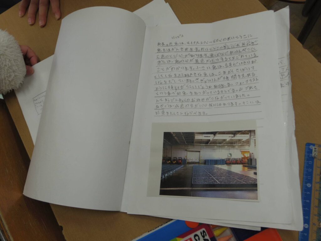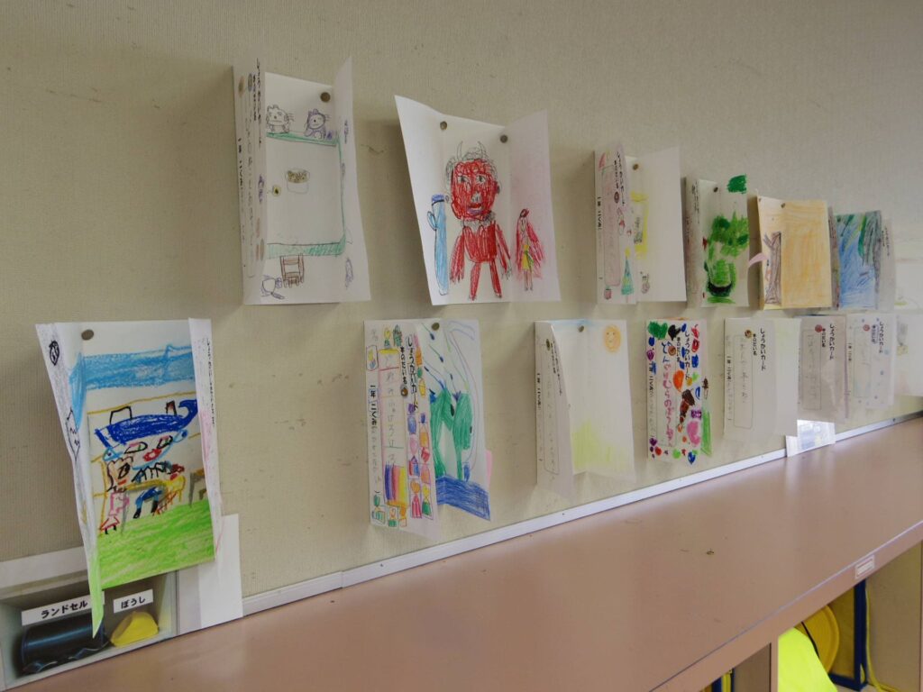教室の後ろには国語で作ったおすすめの本紹介カードが飾られていました。見開きのパンフレット風になっていて、つい、開いて読んでみたくなる工夫がされていました。子どもの作品や成果物がさらに輝くように形式や見せ方を工夫する先生の思いや技術にいつも感心させられます。