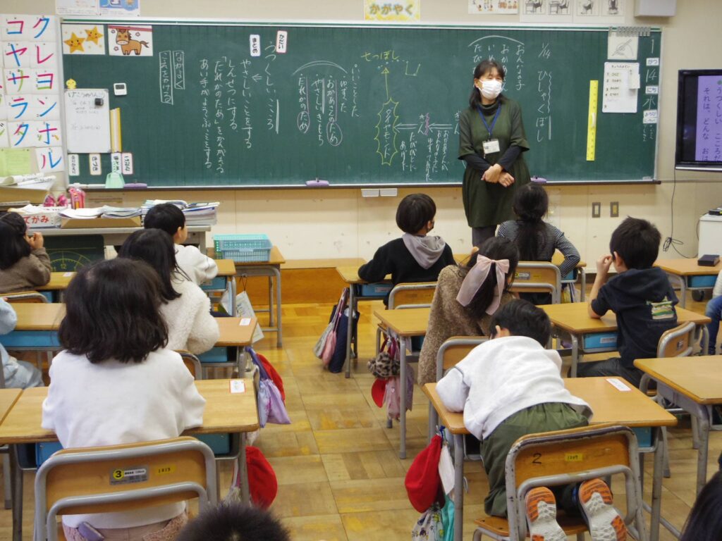 1年2組は道徳でした。「美しい心」がテーマです。「人にやさしく親切にすること」「相手が喜ぶことをする」など、教材文を通して一人ひとりが理解を深めた「美しい心」を、今度予定されている2年生との交流会で活かせるといいねと、意識を共有していました。学んだことを実生活とつなげるのが上手な先生です。