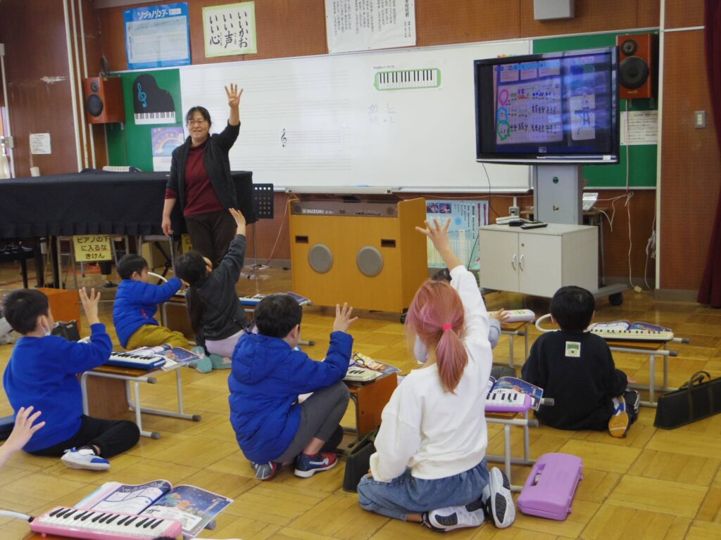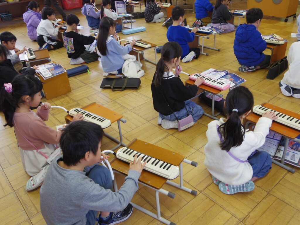 1年1組は音楽室で鍵盤ハーモニカの練習中でした。「1、1、4、4・・・」と唱えながら、正しい運指をみんなで確認しながら練習していました。言語化や身体活動を取り入れた楽しい活動を考えるのが上手な先生です。