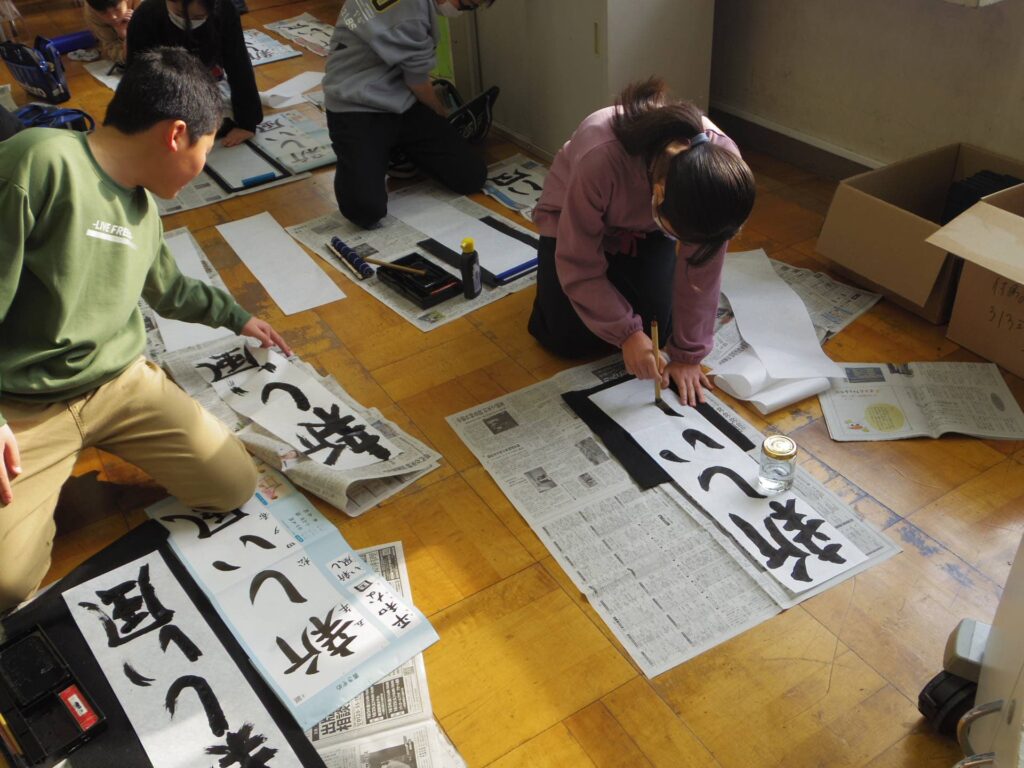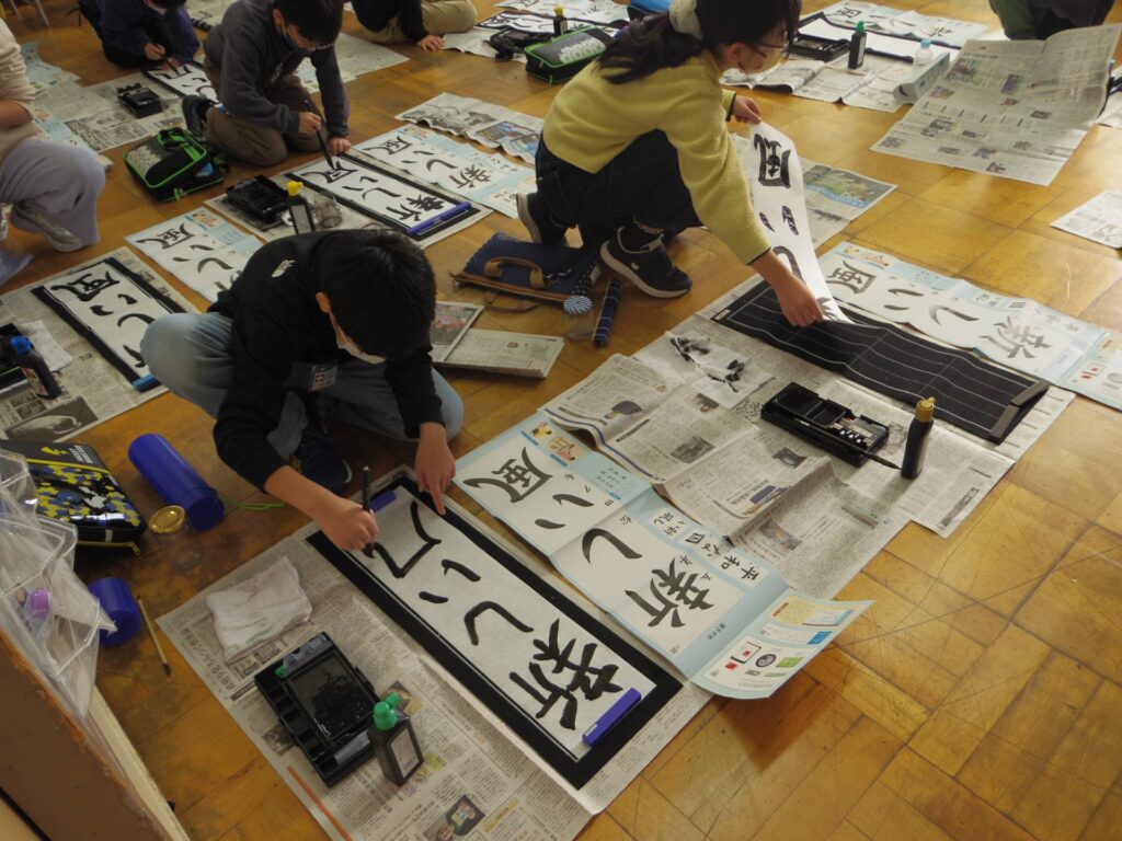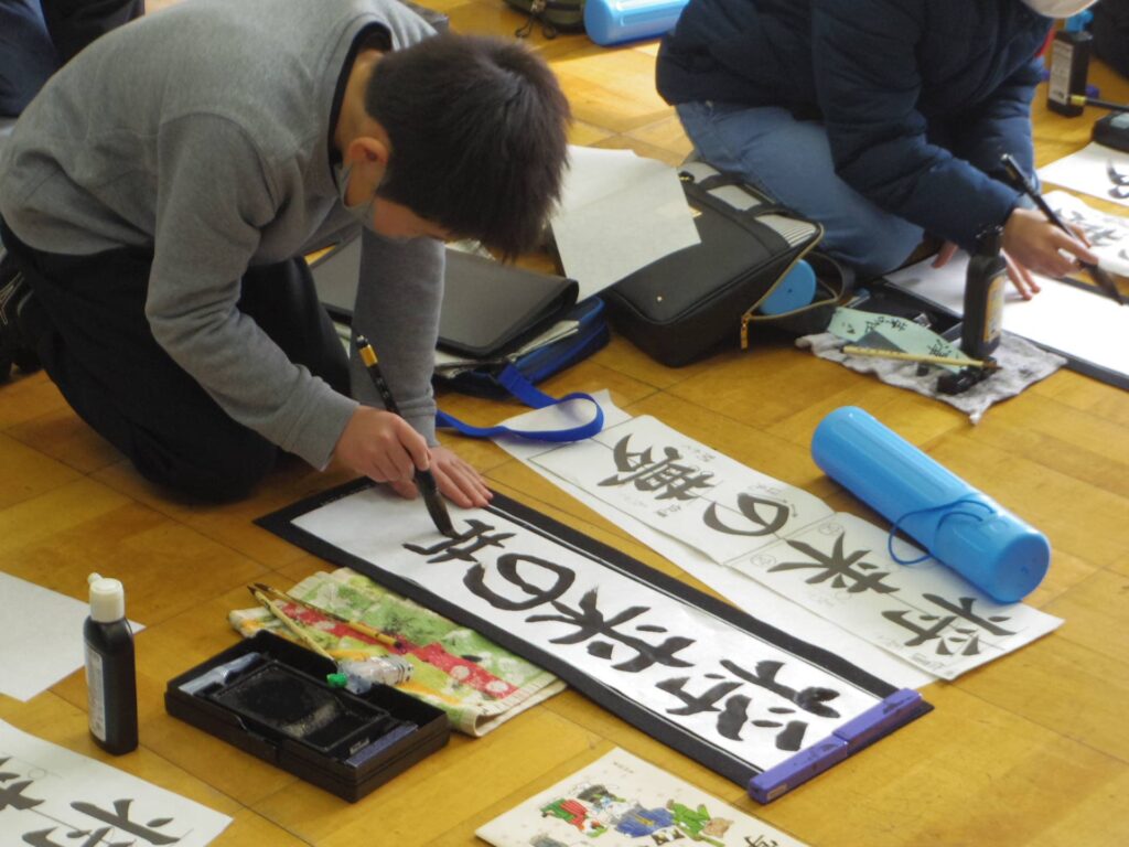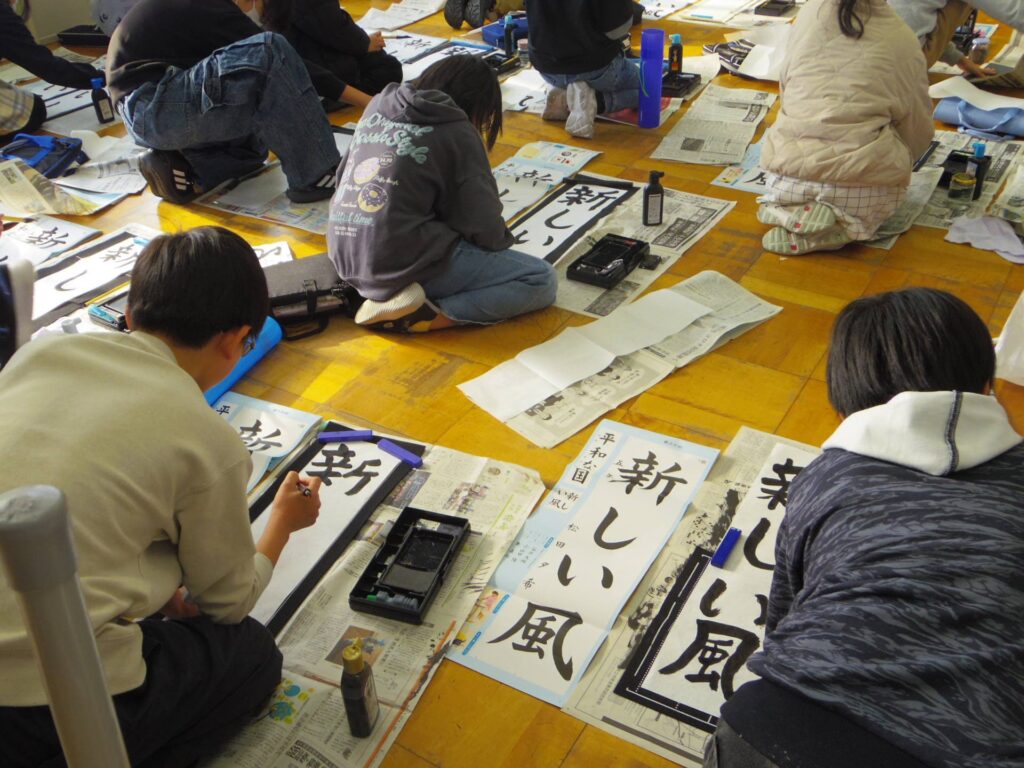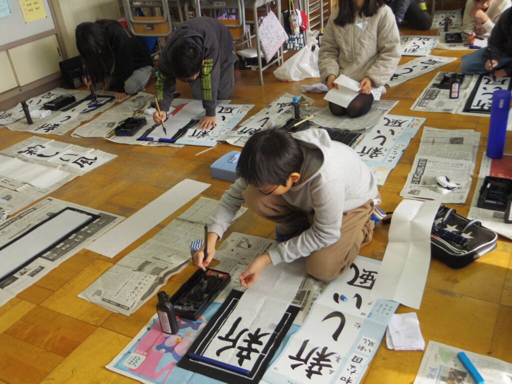 次は5年生の書き初め「新しい風」です。琴のBGM「春の海」をかけて書き初めの雰囲気を出している教室もありました。こちらもとても集中して取り組んでいました。