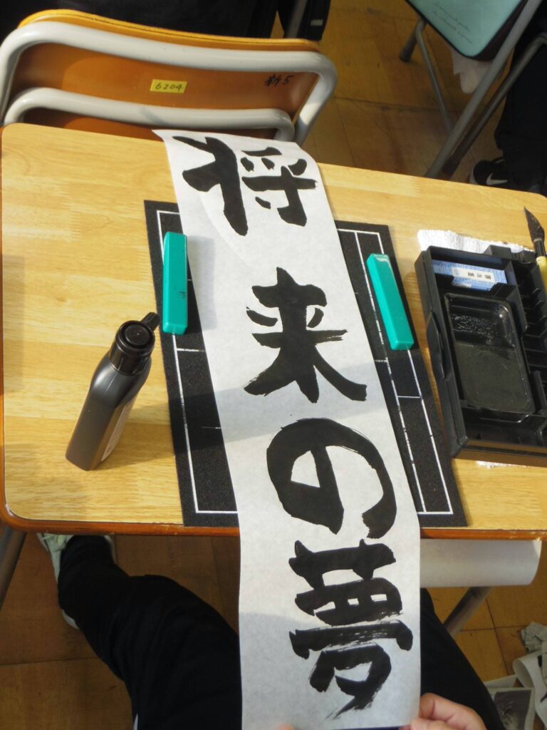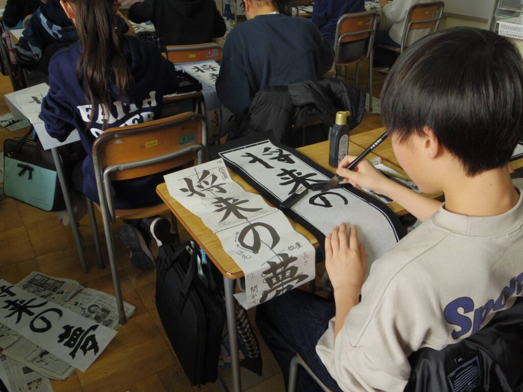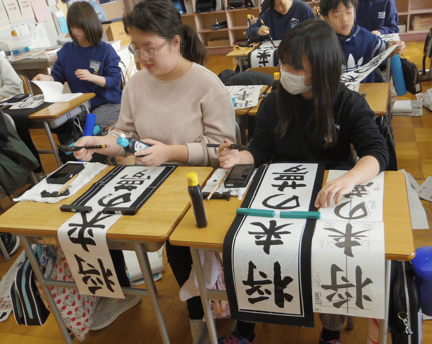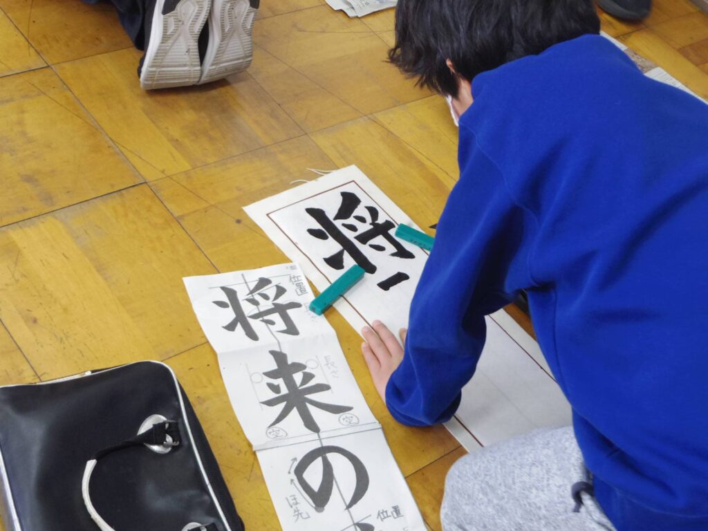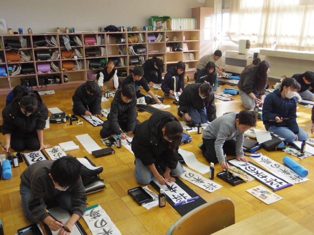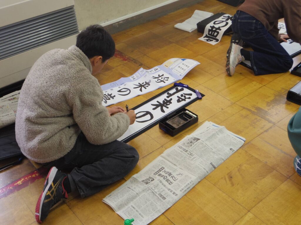 次は5年生の書き初め「新しい風」です。琴のBGM「春の海」をかけて書き初めの雰囲気を出している教室もありました。こちらもとても集中して取り組んでいました。