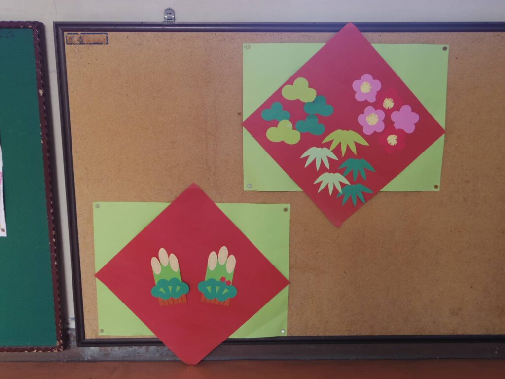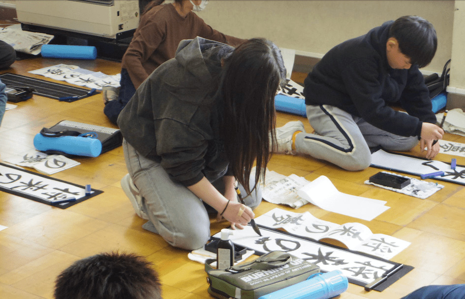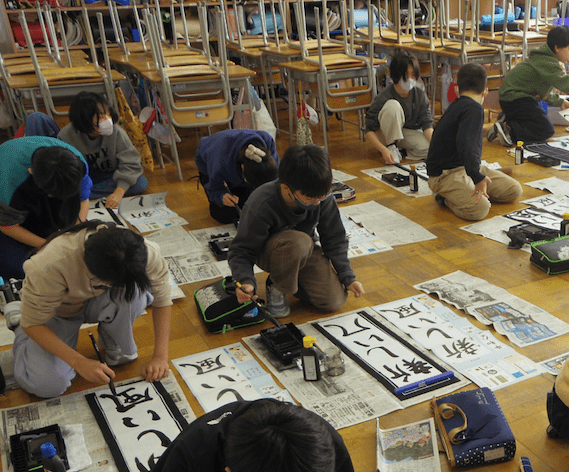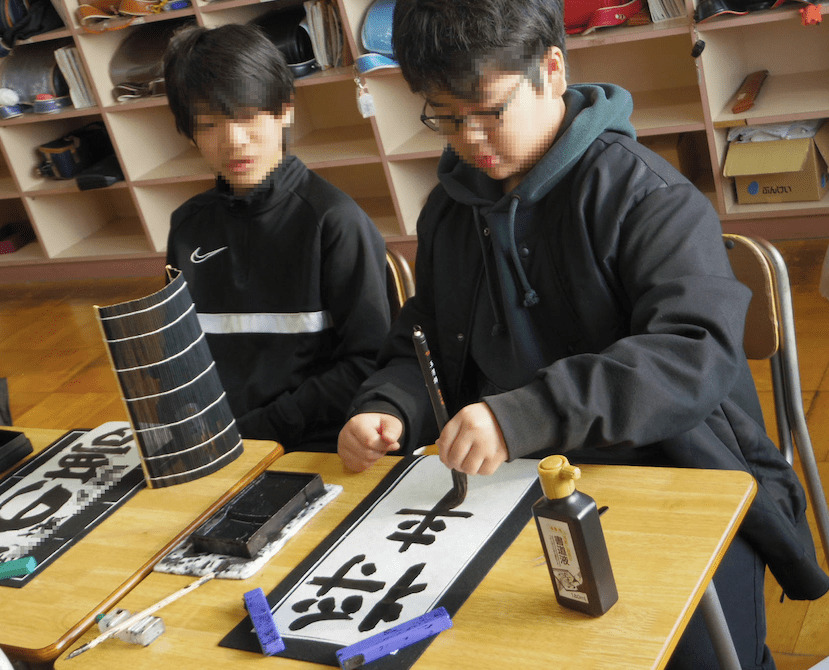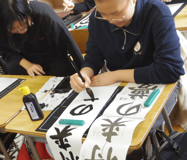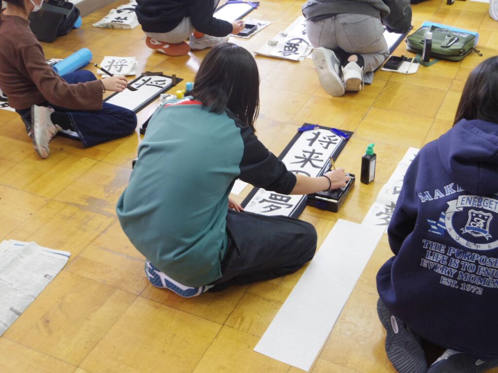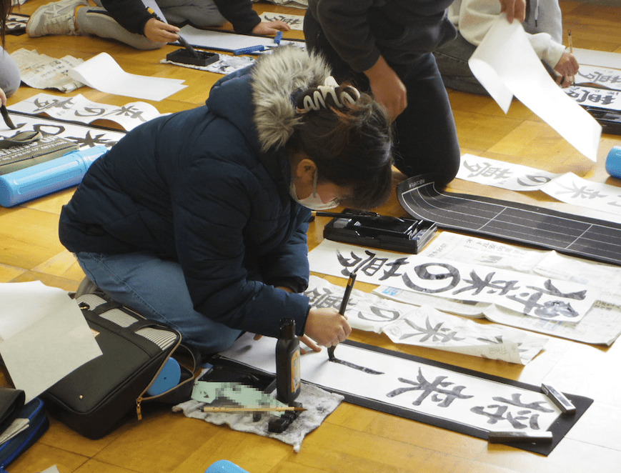 次は5年生の書き初め「新しい風」です。琴のBGM「春の海」をかけて書き初めの雰囲気を出している教室もありました。こちらもとても集中して取り組んでいました。