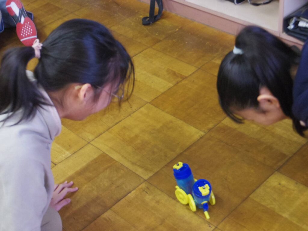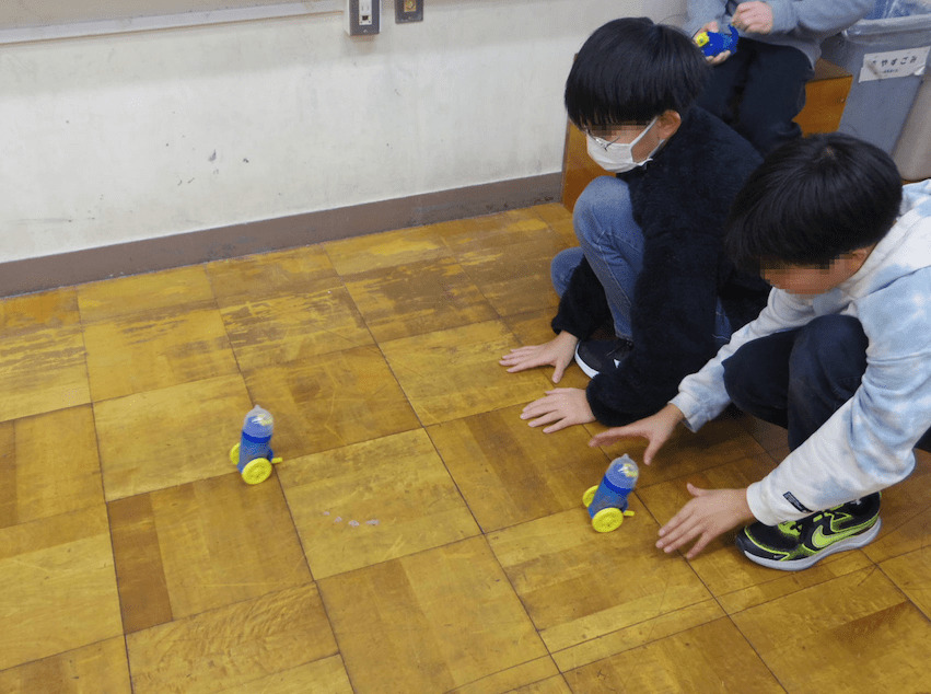 同じ回数を手回ししたら進む距離が同じになるか、確かめています。
