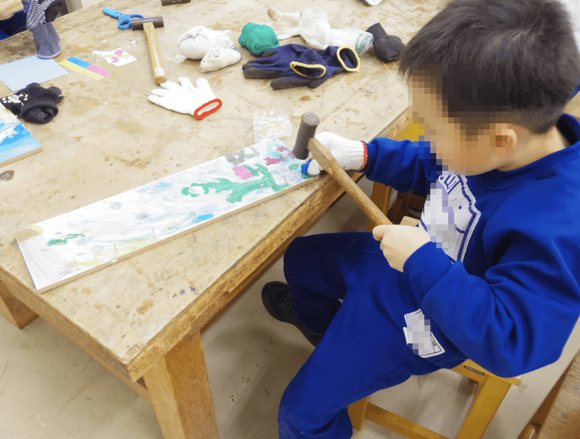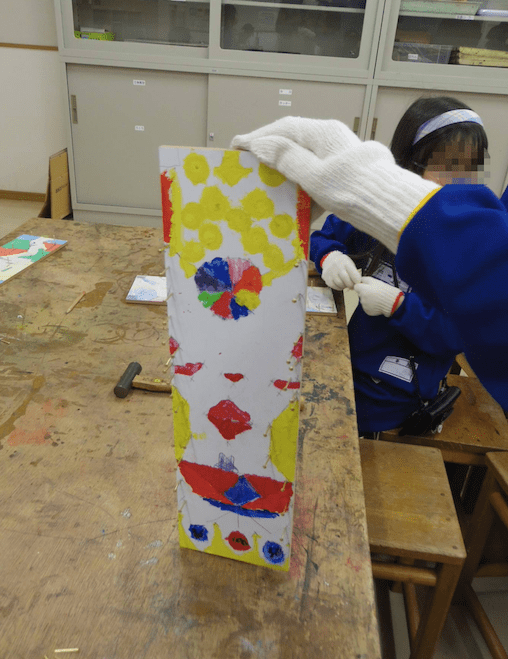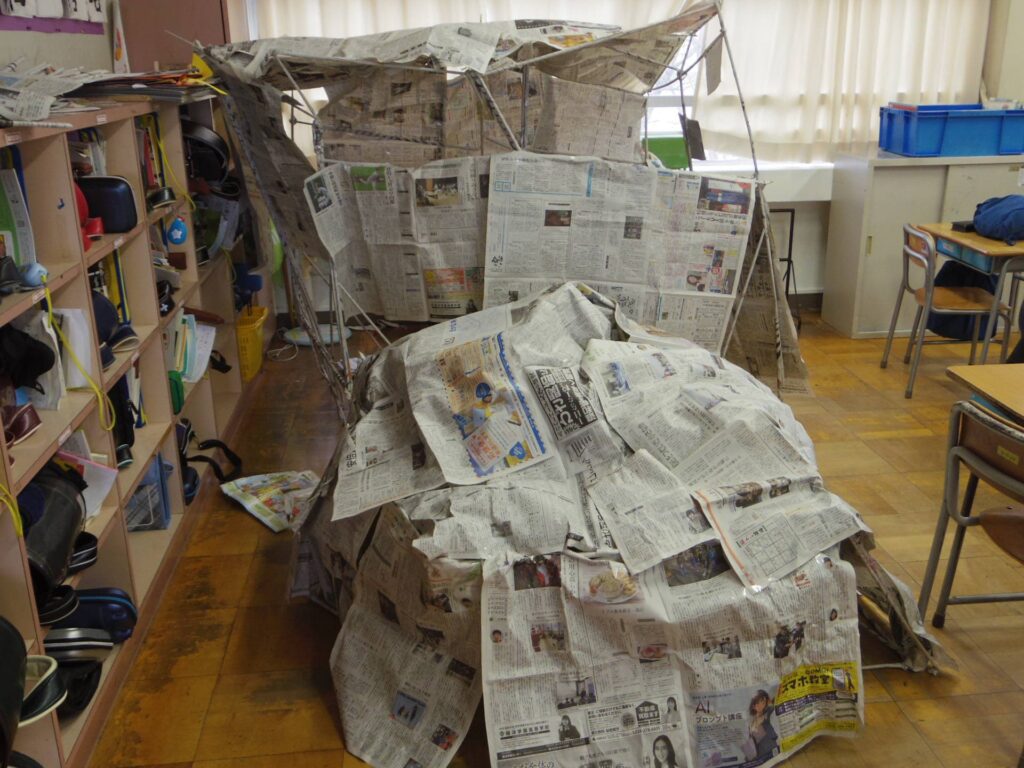 そういえば、昨日の4年1組の新聞紙アートはどうなったかな?教室の後ろに大きな家が2棟ちゃんと建っていました。