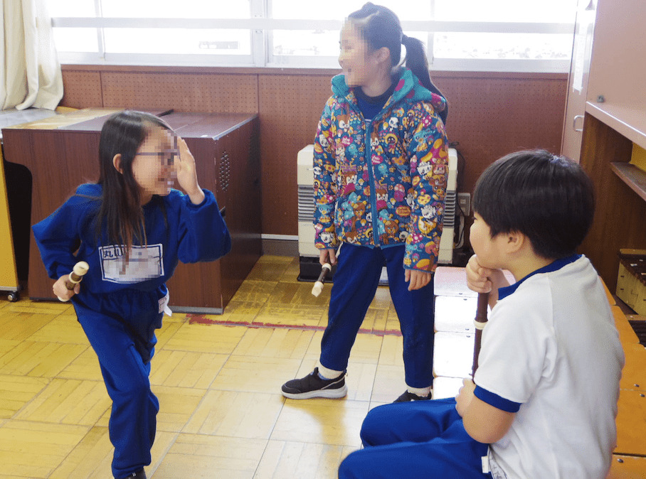 実は、どの音階を吹いているのかを当てるクイズだったのです。子どもたちも真似して友だちとクイズを出し合います。