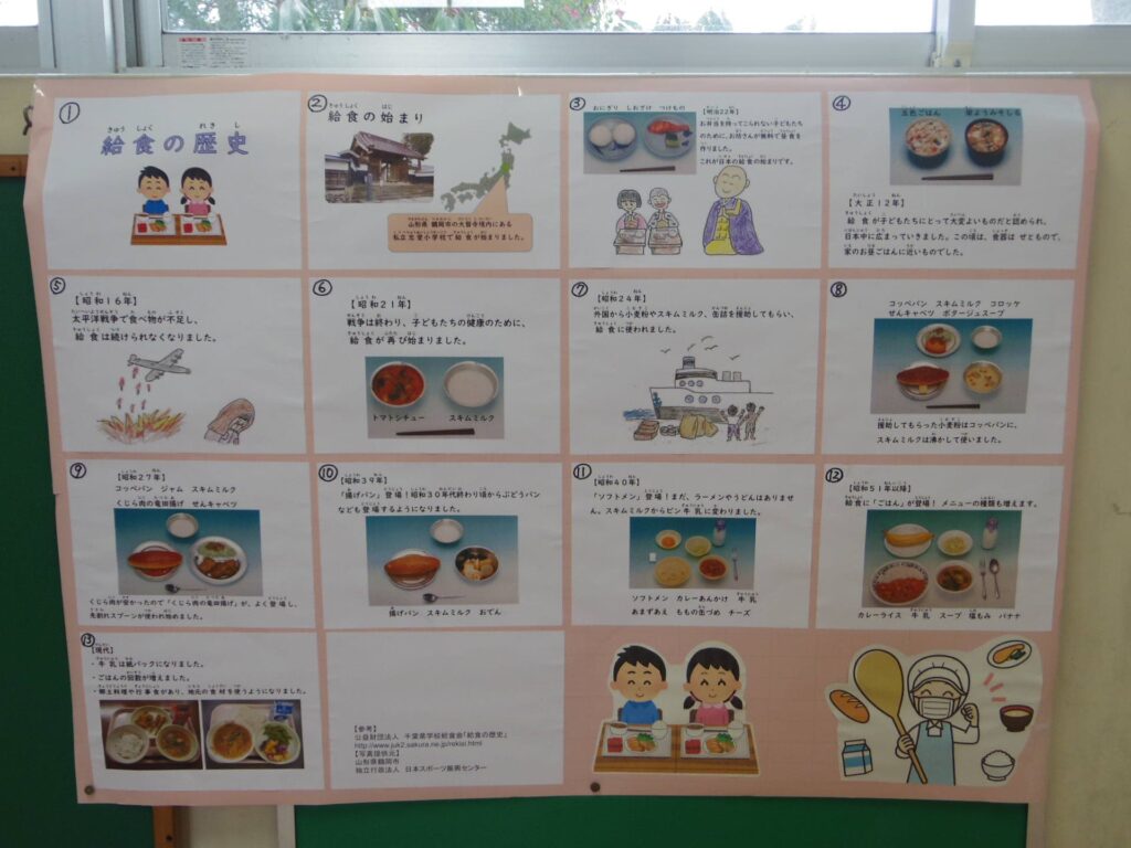 そろそろお腹が空いたなと思いながら廊下を歩いていると、大きなポスターが目に入りました。「給食の歴史」が詳しく書かれています。そう言えば、今日から給食・食育週間が始まったのでした。