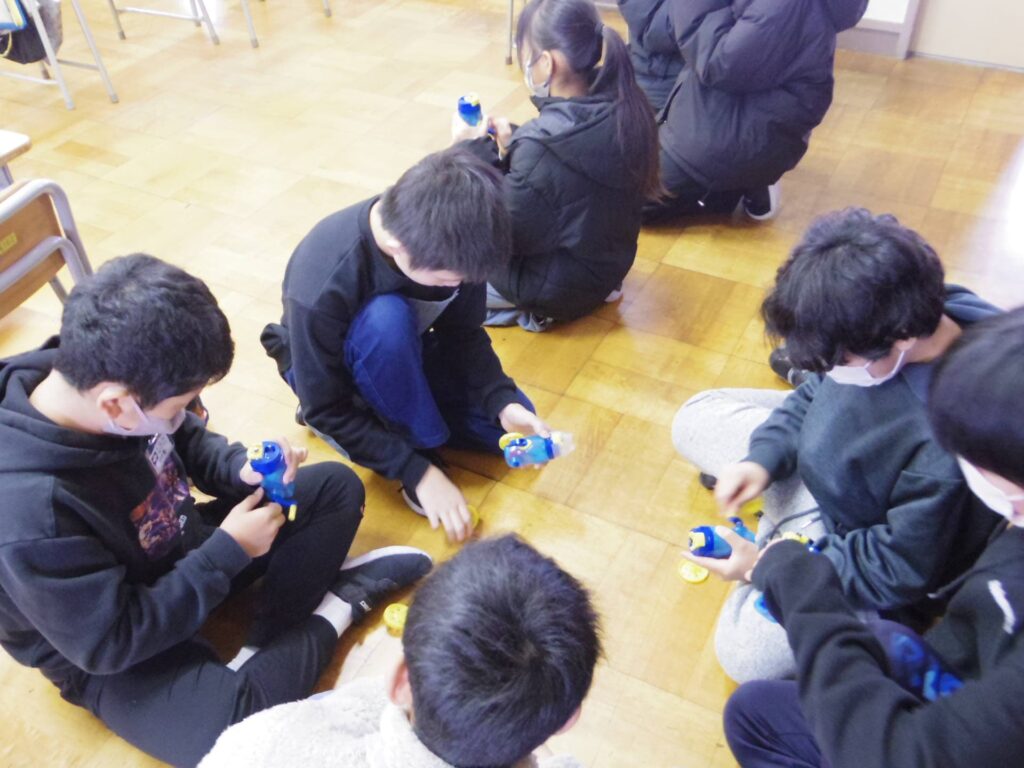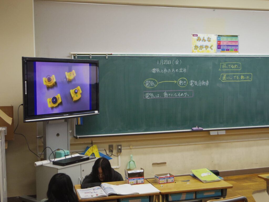 6年1組は理科の授業です。手回し発電機を使った実験です。発電した電気は動きに変換されるのかを試す実験です。