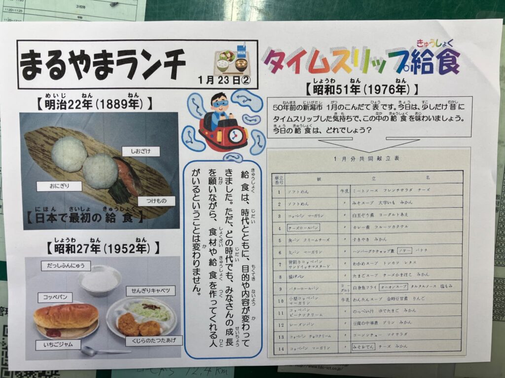 今日はタイムスリップメニューです。50年前に新潟の給食で出されていた「コッペパン」です。チョコレートを塗って食べました。昭和人としてはとても懐かしいメニューです。