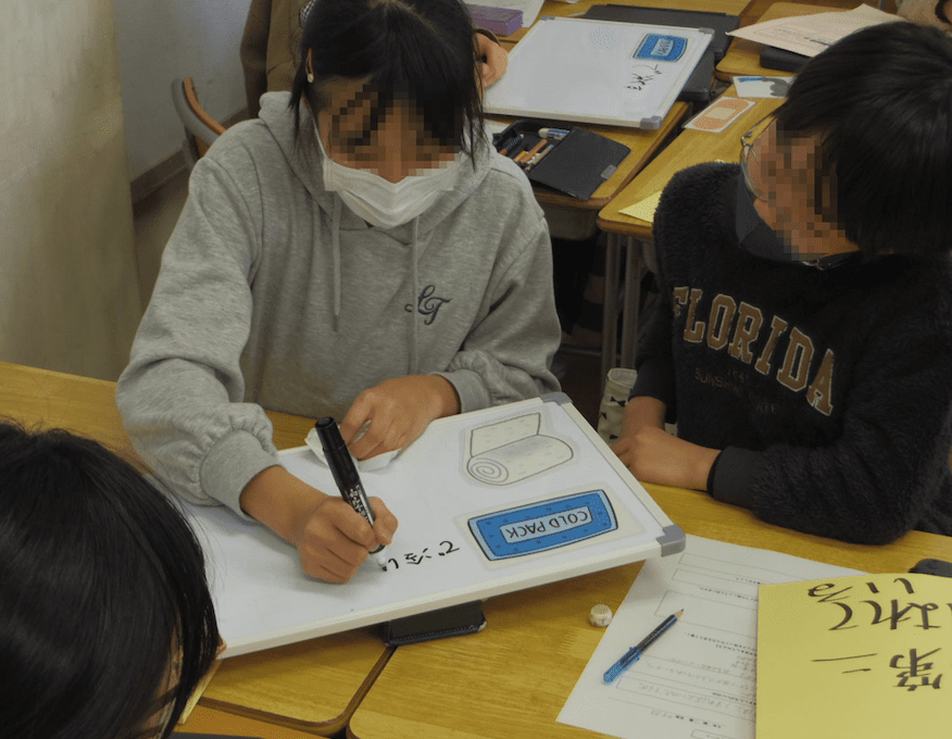 それら、グループの考えを全体で共有しました。ケガの手当3原則を応用すれば、いろいろな場面で臨機応変にけがの手当てができることを確認し合いました。