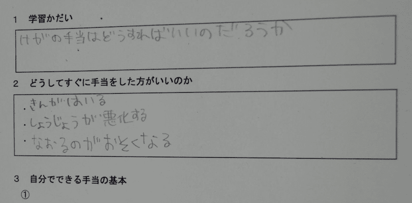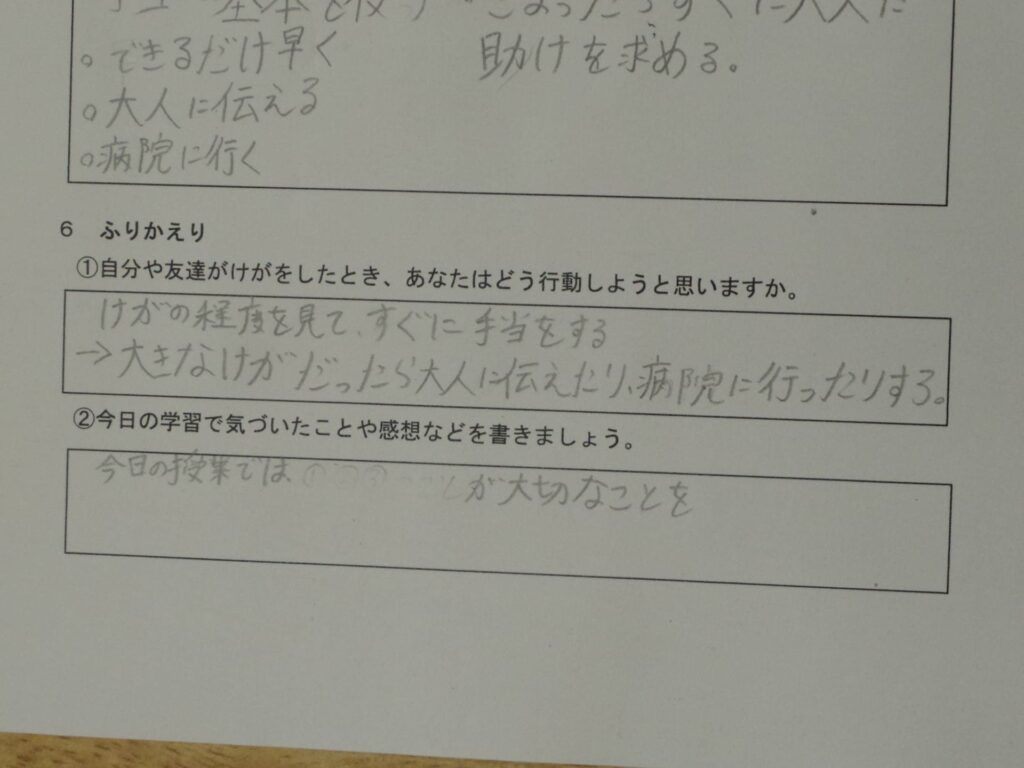 この学習を通して、誰かがケガをする場面にもし出会ったら、手当てをしたり、助けを求めたりするなど、自分でできることを実行する自信と意欲を高めることができました。