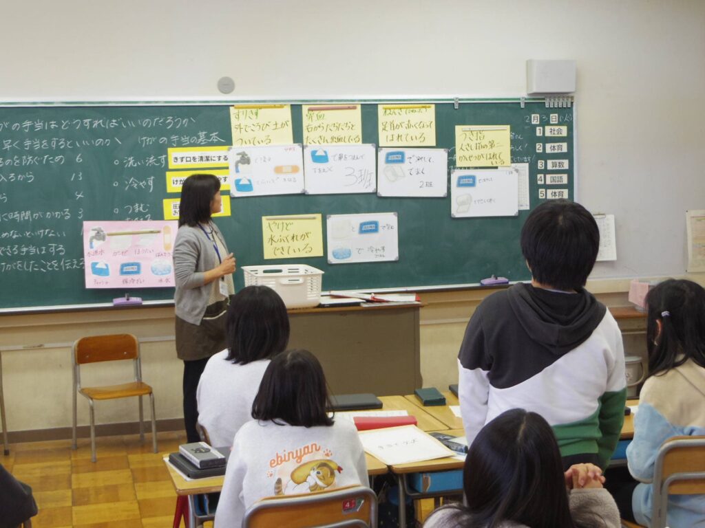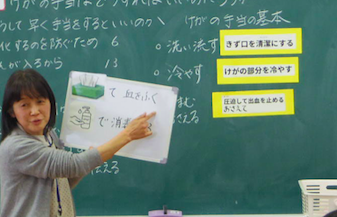 そして、養護教諭の先生からケガの手当ての3原則について教えてもらいました。「洗う」「冷やす」「おさえる」です。