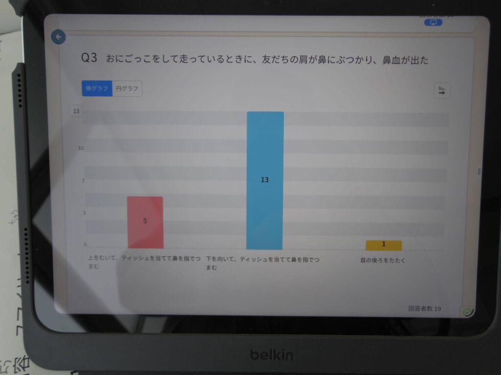 まずは、学校で起こりうる場面で、あなたならどのように行動するかをアンケート調査しました。鼻血が出たらどうするのが正解だと思いますか?