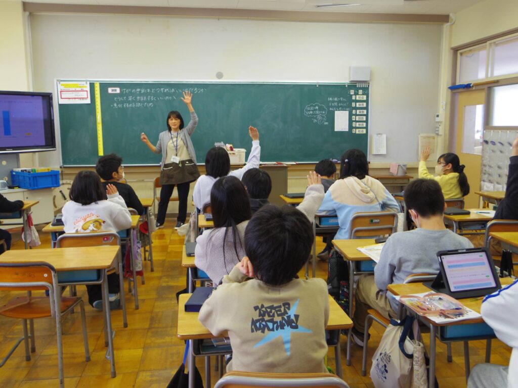 5年1組の保健の授業におじゃましました。養護教諭の先生と担任の先生とのTT授業です。学習課題は「ケガの手当はどうすればよいだろうか?」について、子どもたちが自分の経験を基に考える場面です。