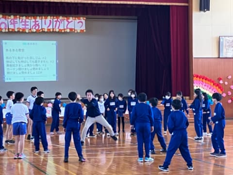 3年生では、お休みしている先生の分まで、隣のクラスの先生が一緒に体育の指導をしてくれています。