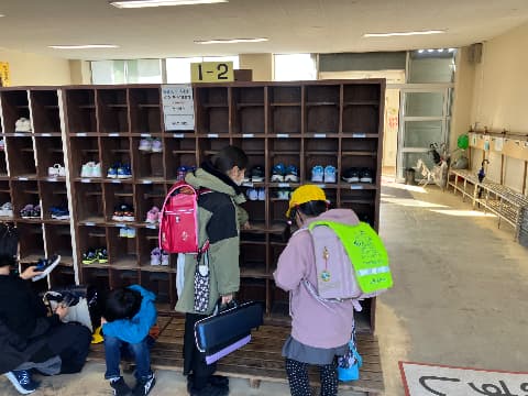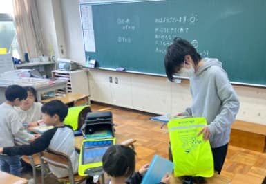6年生が1年生の下駄箱のお世話や朝の支度を手伝ってくれています。