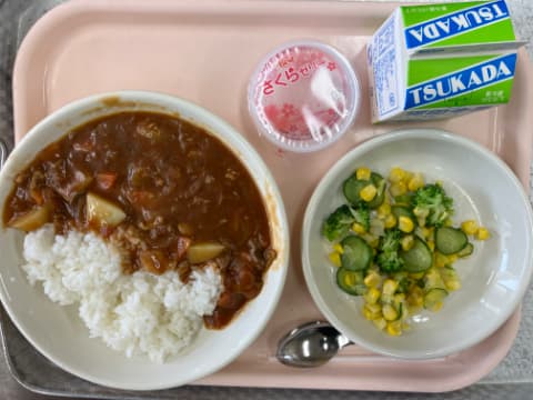 その他、6年生はのんびりと花見に出かけていきましたし、3年生は5年生と一緒に出かけていきました。心も体もポカポカになって帰ってきた後は、楽しみにしていた給食です。ハヤシライスとサラダ、デザートには桜ゼリー!