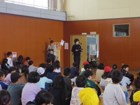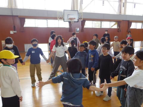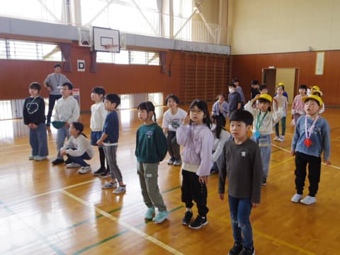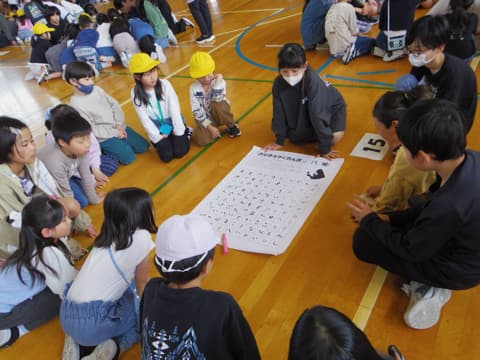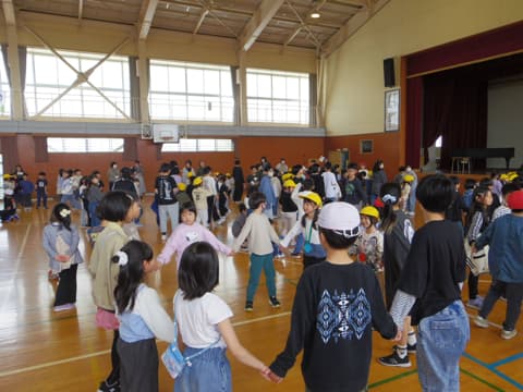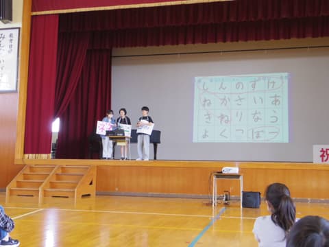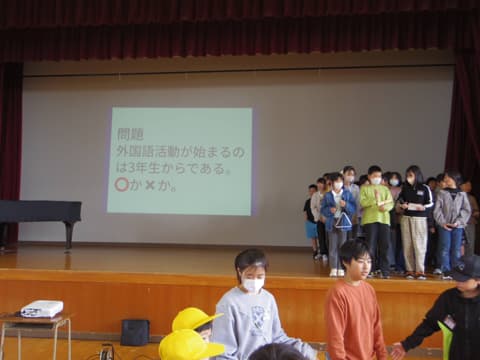 次は5年生が考えた学校クイズです。◯だと思ったらスマイリーチームで手をつなぎ立ち上がり、✖️だと思ったら座ります。校長先生の名前、全校児童の数、先生たちの数など、いろいろな問題が出されました。