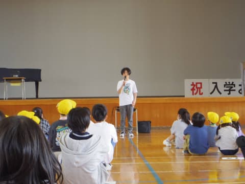 開会の挨拶です。縦割り班「スマイリーチーム」でいろいろな活動を楽しんで仲を深めようと呼びかけました。