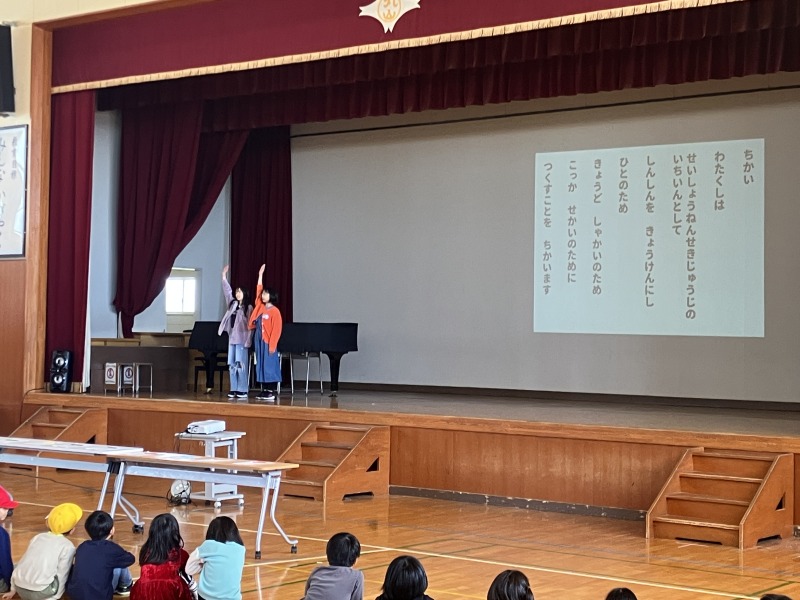 そして,1年生からお礼のメッセージでは,この1ヶ月間たくさん練習して覚えた校歌をうたってくれました。元気な歌声が体育館じゅうに響き渡りました。