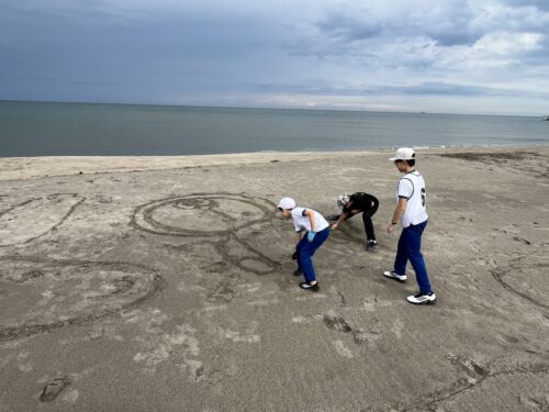 隙間時間には海辺で縦割り遊び。学年関係なく砂遊びに夢中になっていました。こちらでも砂浜に巨大な絵が!
