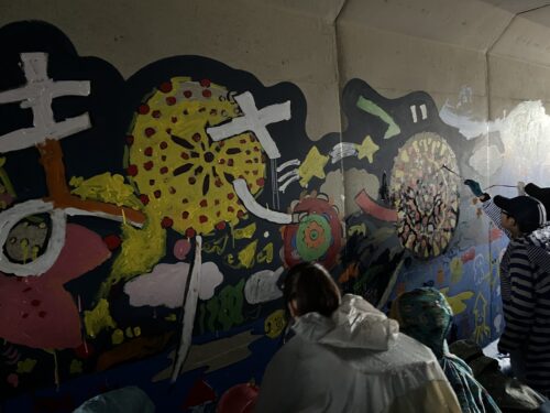 まずはトンネルアート。ほとんどの子どもが初めてであろう巨大壁画に挑戦です。アクリル絵の具を体に着けながらも、真剣な眼差しでダイナミックに描くその目はまさにアーティスト!ぜひ完成品を見に行ってください。