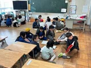 読み聞かせが終わったら、全員でおすすめの本紹介です。「この後、主人公はどうなるでしょうか。続きはぜひ読んでくださいね!」とても読みたくなる紹介が沢山ありました。子どもたちのおすすめの本紹介カードは廊下に掲示されていますので、参観の際にぜひご覧ください。