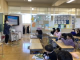 お口の健康教室を1年生で実施しました。歯科衛生士さん、保健師さんから歯に良い食べ物や歯の磨き方を教えていただきました。
