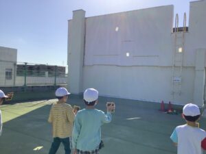 3年生、後期最初の理科の学習は、「光を調べよう」です。1時間目は、どのクラスも「かがみではね返った日光は、どのように進むのか」という課題で、予想を立て、屋上に上がり実験をしました。まっすぐ進むことが …