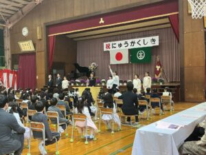 4月10日(金)、令和8年度入学式が行われ、105名の1年生が、女池小学校に入学しました。おめでとうございます!女池小学校のみんなで、この日を待っていました! 「1年生のみなさんも立ちましょう …
