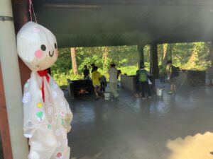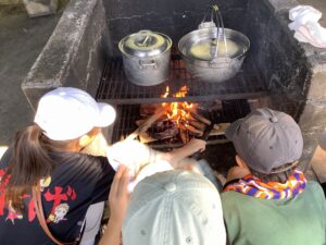 調理器具を器用に使いこなし、次から次へとカレーの具材が鍋に投入されていきました。夏休み、おうちで取り組んでいただいたカレーづくりの経験が活きていました。また、かま場では、息のあったチームプレイで勢いよく火が巻き起こり、調理チームとの連携で、見事なタイミングで鍋が火にかけられていきました。