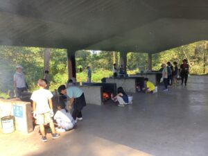 絶好の野外すいはん日和!おいしいカレーライスのできあがりを目標に、調理班とかま場(火おこし)班に分かれて、調理や作業を行いました。
