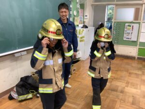 3年生の社会科の学習では、消防士の方をお招きして、リトルファイヤースクールを行いました。新潟市の消防のしくみや活動について、丁寧にわかりやすく教えていただき、子どもたちはみんな興味津々で耳を傾けていました。また、水消火器を使った消火体験や防火服の試着、煙の中を通る体験など、ふだんはなかなかできない貴重な活動にも取り組むことができました。実際に体を動かしながら学ぶことで、消防の仕事の大切さや防火の意識を一層高めることができたようです。