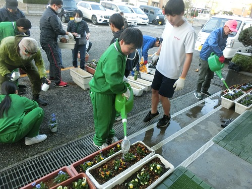 11月20日(木)放課後、環境委員が中心となり、地域の方々の協力のもとでプランターの花植えを行いました。植えられた花は南浜中学校バス停前に飾られます。通る人やバスを待つ人の心を和ませてくれることと思います。
